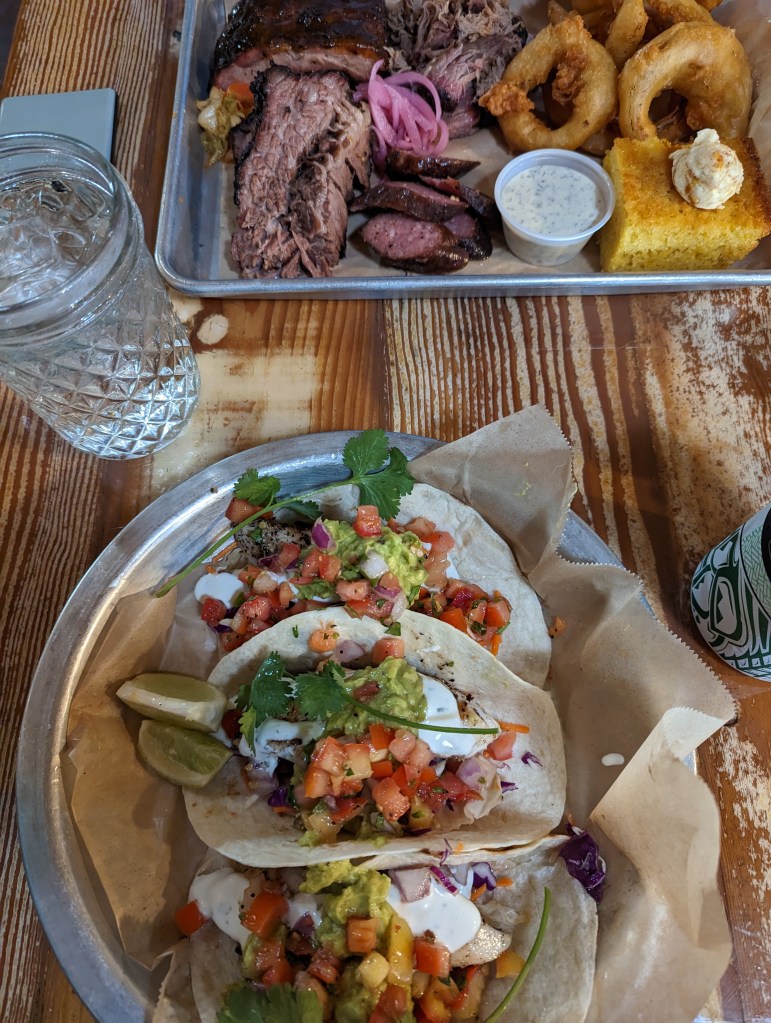 Before heading up North to Waipi’o Valley Lookout, we stopped by for some lunch at a rustic café and bar called The Fish & The Hog, located in Waimea, HI. We highly recommend stopping by here – their barbecue was amazing as was their famous Cheddar and Green Chile cornbread! Bob got the sampler, and I got the fish tacos. He was not a happy camper that I was nibbling his food 😊